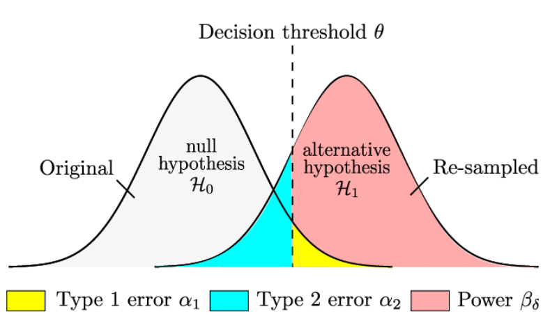 모집단이 정규분포를 따른다고 할 때, 귀무가설과 대립가설의 decision threshold를 정함에 따라 1종오류, 2종오류, 검정력을 확인해, 가설이 참인지 거짓인지를 판단할 수 있다.