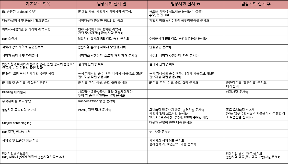 기본문서란, 임상시험 수행에 필요한, 수행으로 얻어진 모든 문서를 포함하고, 임상시험 실시 전, 실시 중, 실시 후의 필요한 기본 문서들을 식약처의 '의약품 임상시험 기본문서 관리를 위한 가이드라인'을 참고하여,