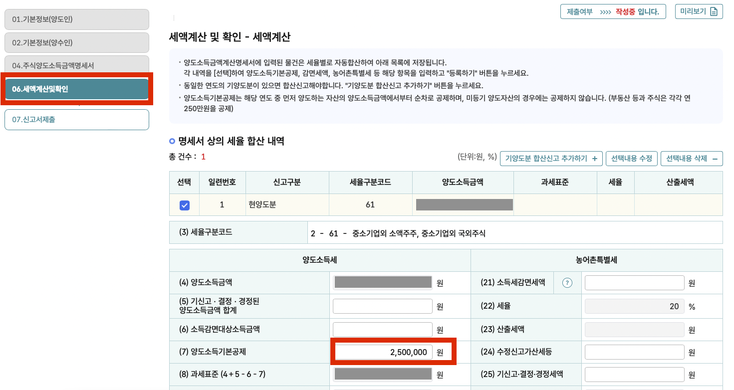 10. 세액계산및확인에서 양도소득기본공제를 2,500,000원으로 입력 (나머지 입력 필요없음)> 등록하기 클릭> 저장 후 다음 이동