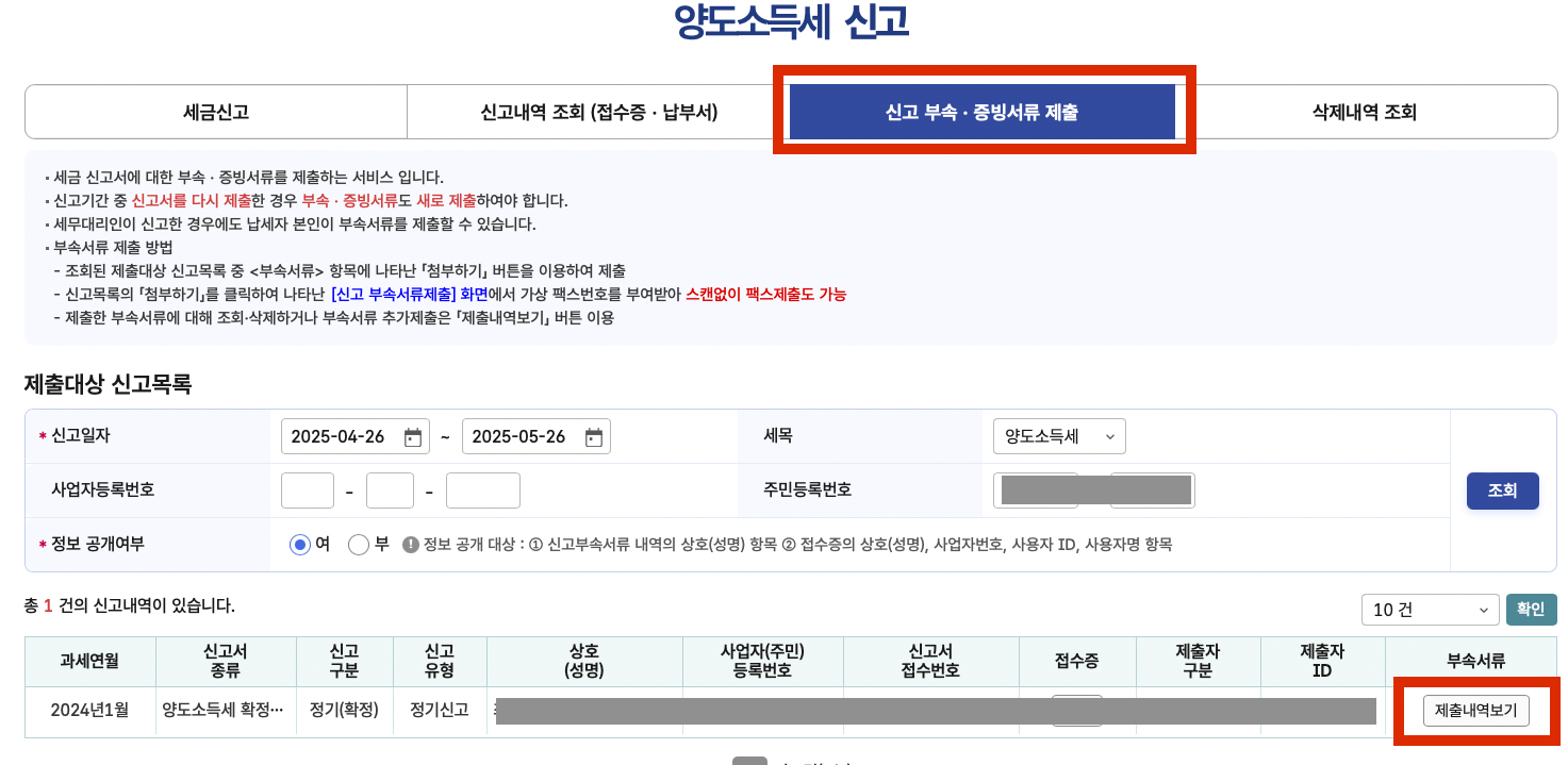 13. 양도소득세 신고 페이지로 다시 돌아가서, 신고부속 증빙서류 제출 클릭> 부속서류를 아까 한국투자증권에서 다운받은 파일을 업로드.