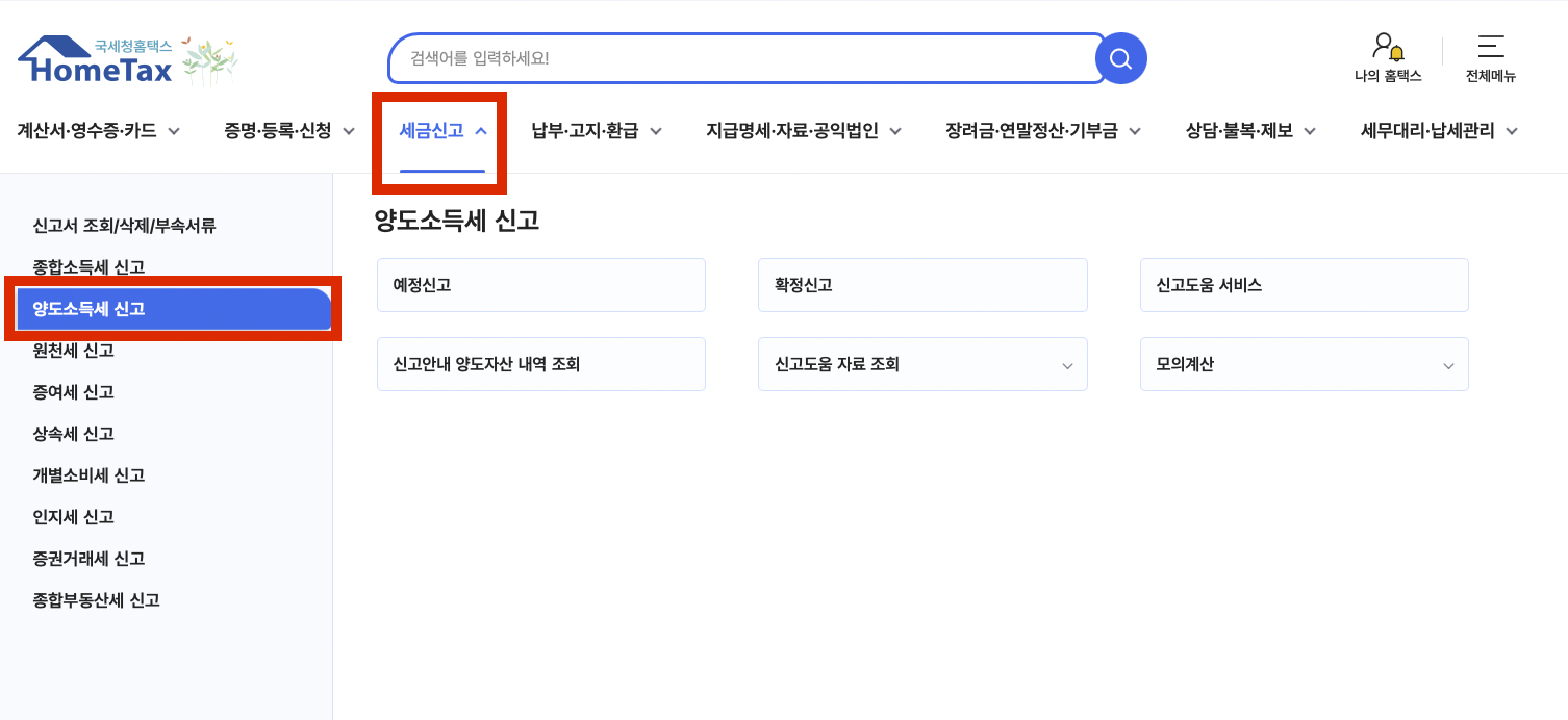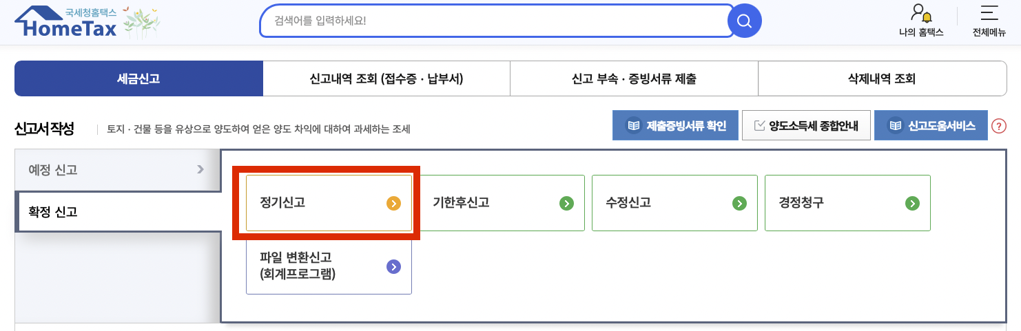 1. hometax.go.kr 접속> 세금신고> 양도소득세 신고> 확정신고 클릭