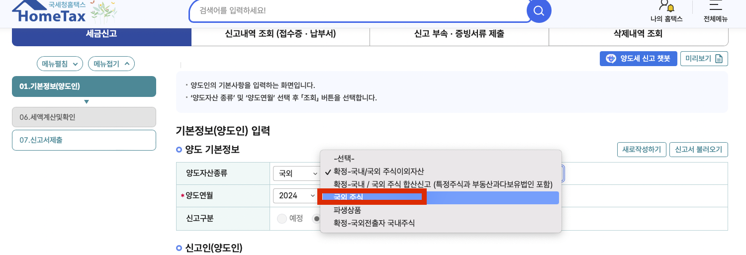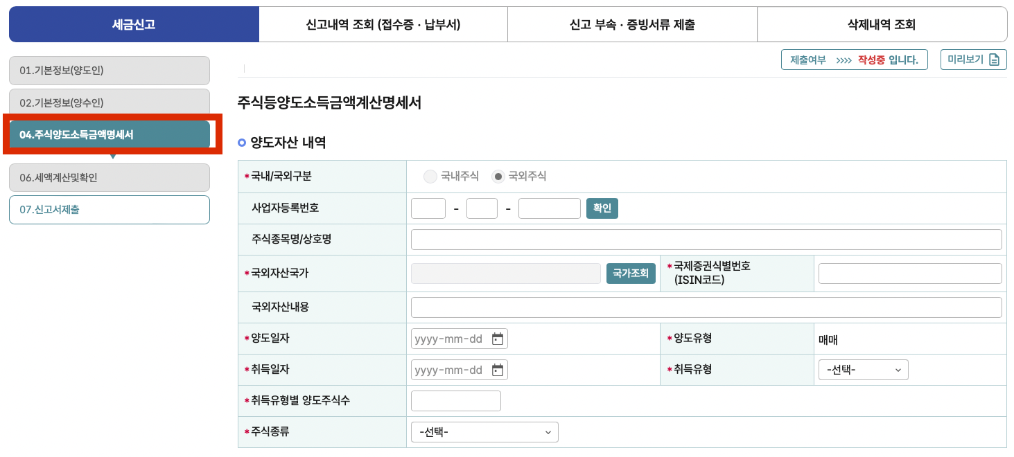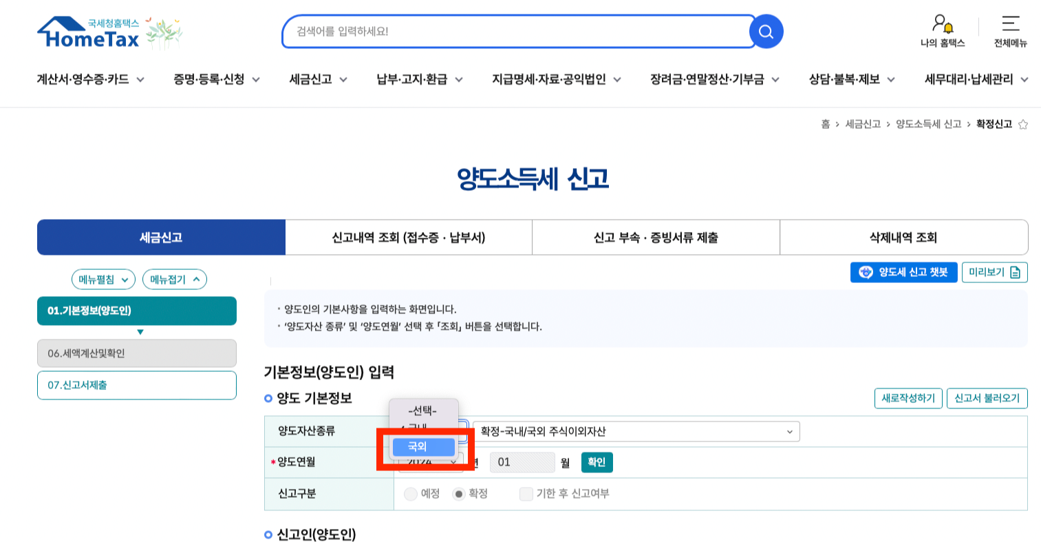 양도자산종류: '국외' '국외주식' 선택