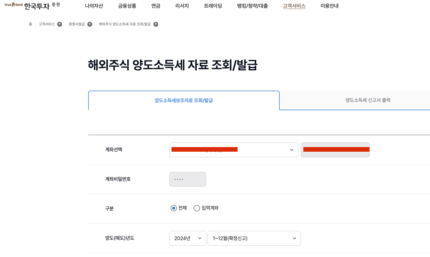 고객서비스> 증명서 발급> 해외주식 양도소득세 자료 조회/발급 클릭