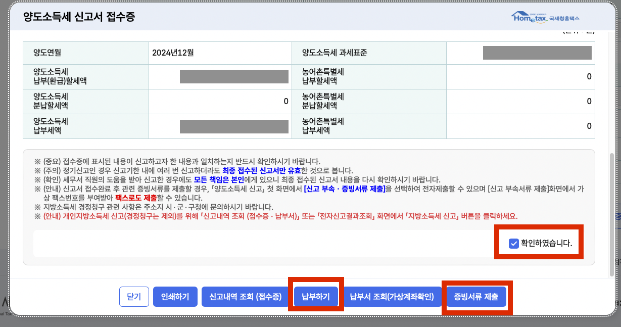 12. 신고서 제출하면 아래와 같은 팝업창이 뜸> 확인하였습니다 클릭> 납부하기 and/or 증빙서류 제출