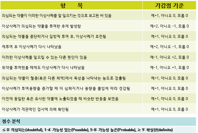 용어별 평가기준을 수치화, 체계화하기 위해 1981년 고안된 나란조 Naranjo 인과성 평가 알고리즘도 존재하며, 점수에 따라 네가지로 분류할 수 있다.