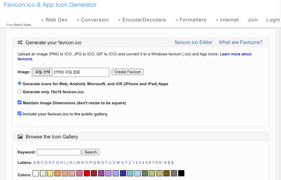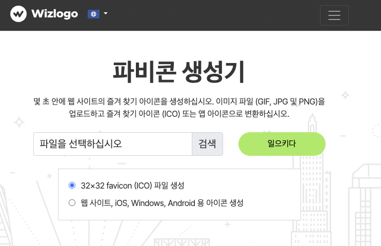 이미지 파일을 업로드하면 웹 사이트, ios, Windows, Android 용 아이콘 이나 32 x 32 favicon (ico) 파일 생성 가능