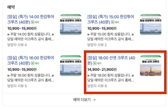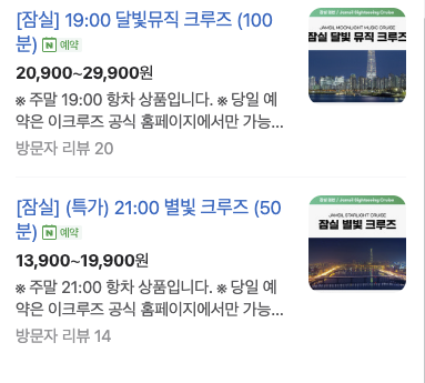 우선은 한강 크루즈 검색! 하면 여의도도 있고, 잠실도 있는데 우리는 집과 가까운 잠실로 선택