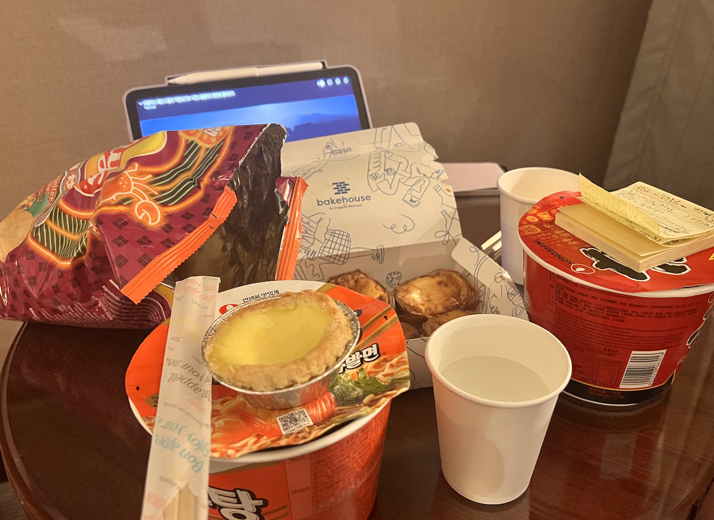 오늘 너무 뽈뽈뽈 돌아다니느라 한 끼 밖에 못먹어서 급하게 컵라면과 남은 에그타르트를 먹어 치웁니다.