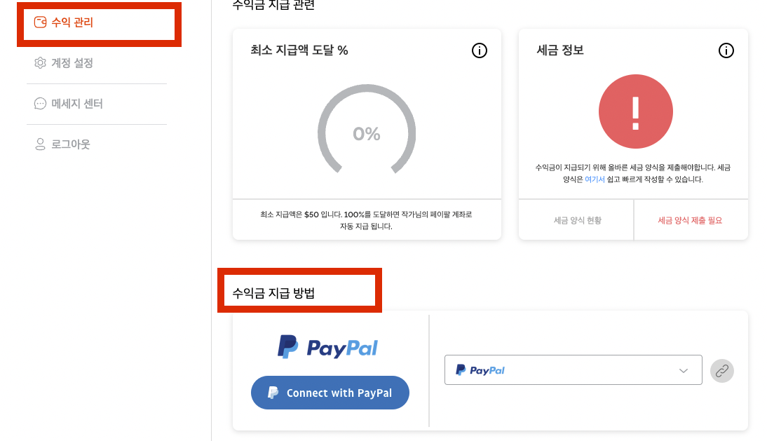 8. 승인 완료 후, 마이페이지 왼쪽 메뉴 수익관리 클릭> 수익금 지급 방법 Paypal 설정