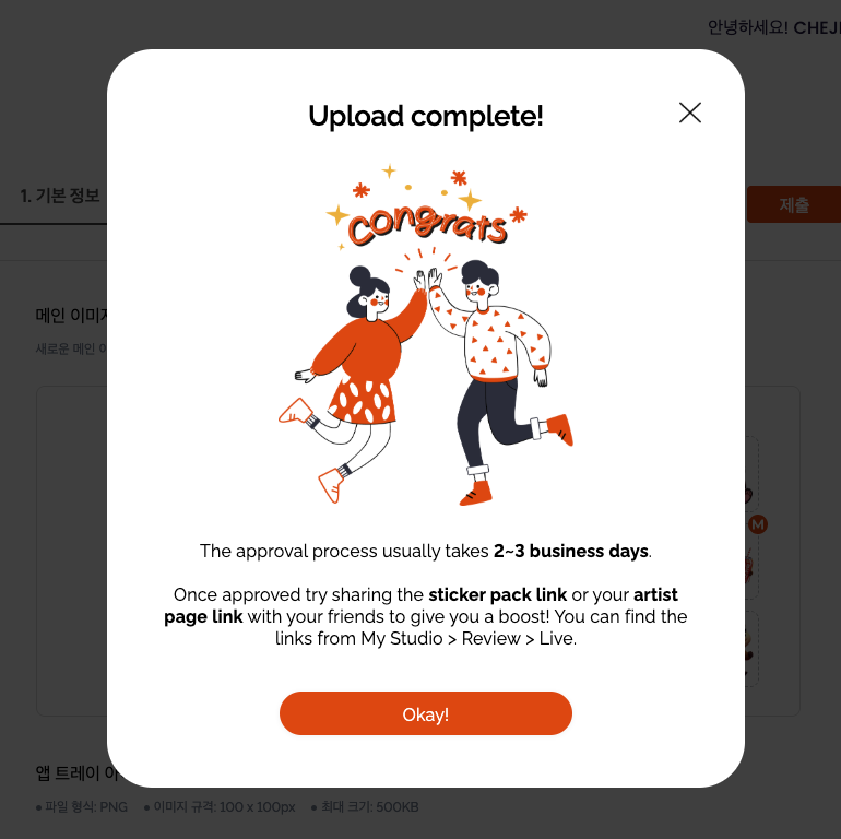 7. 제출 후 Upload complete 팝업 뜨면 완료! (승인까지 2~3 영업일 소요됨)