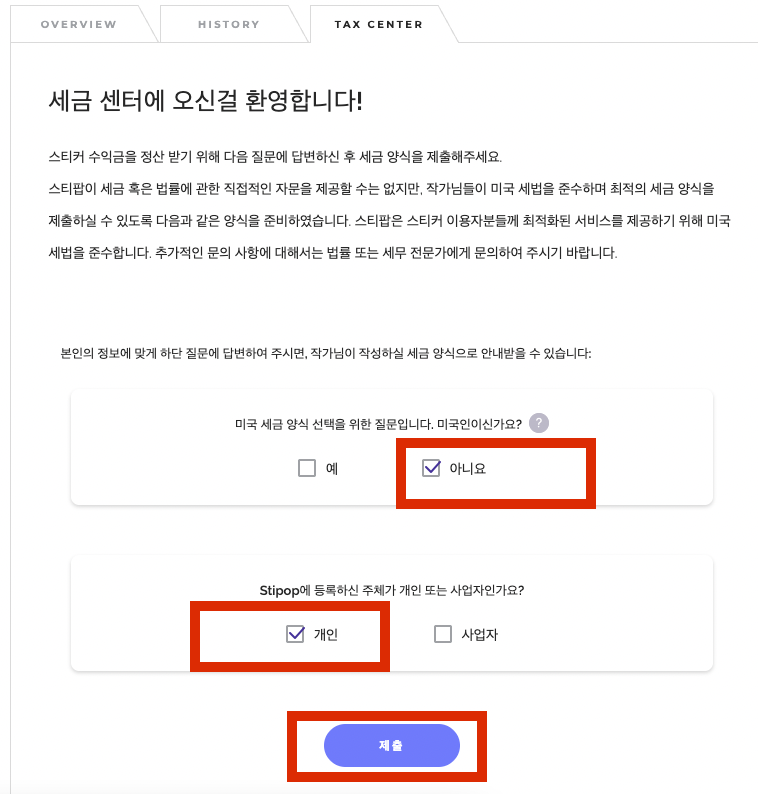 9. 다시 마이페이지 왼쪽 메뉴 수익관리 클릭> 세금 양식 제출 필요 클릭(수입창출 시 세금정보 필요)>미국인 '아니오', '개인' 클릭> 제출