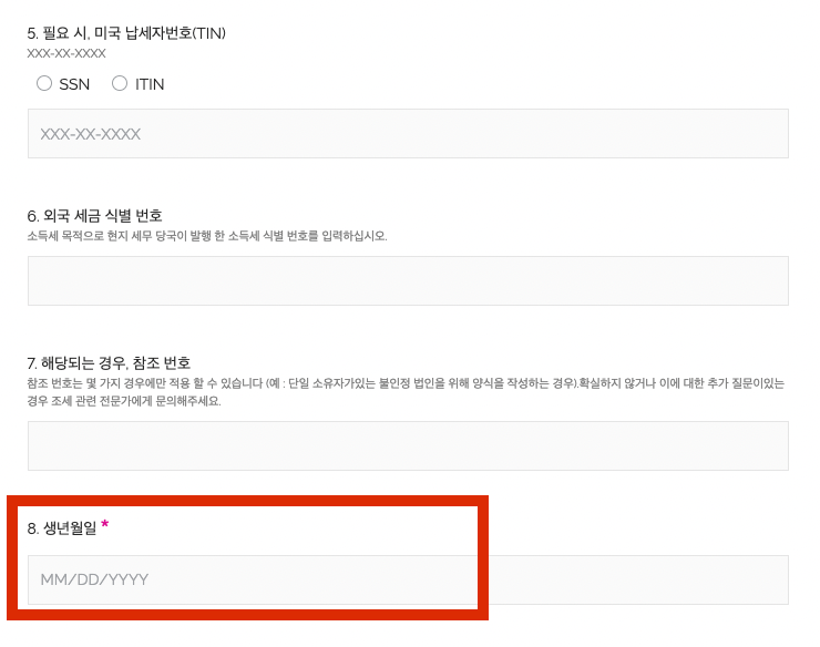 10. Form W-8BEN을 작성 페이지 자동 팝업> 필수항목 * 만 작성