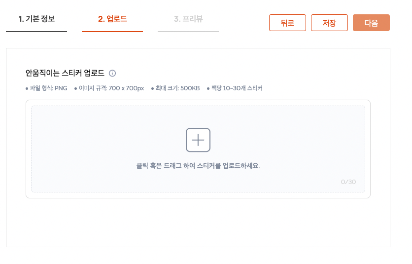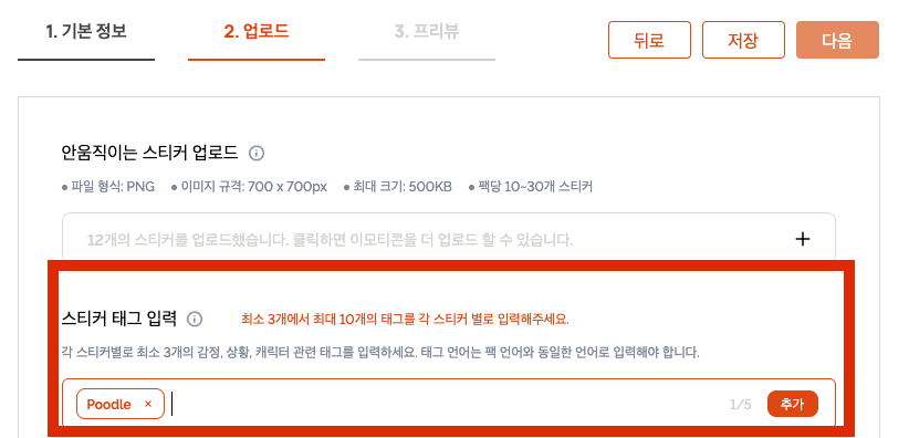 5. 만들었던 스티커 파일을 드래그하여 업로드 후, 스티커 별 태그 입력 (영어로!)>다음