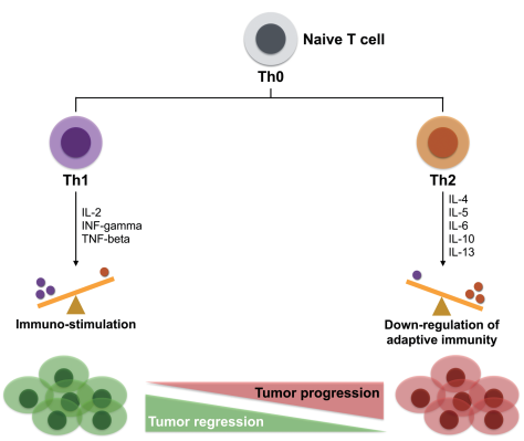 일반적으로 tumor progression에서의 Th1/Th2의 balance는 Th1 쪽으로 기울어지게 되면, 면역반응이 촉진되어 암세포의 과도한 증식을 막고, Th2 쪽으로 기울어지게 되면, 적응면역의 down-regulation으로 인해, 결국 암세포 성장을 촉진하게 된다.